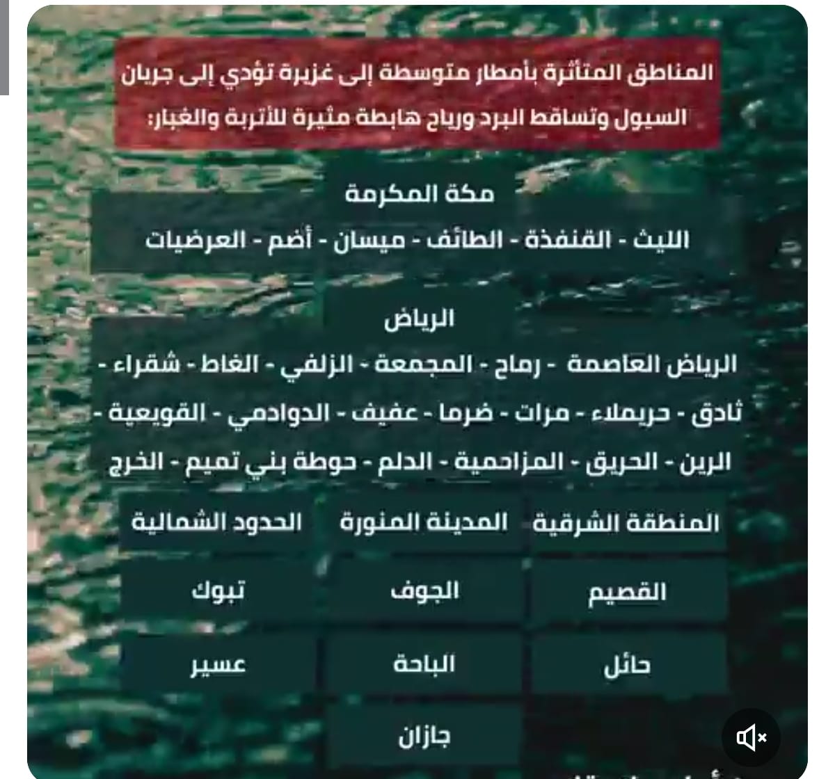 وأوضحت أن منطقة مكة المكرمة، ستتأثر بأمطار متوسطة إلى غزيرة تؤدي إلى جريان السيول وتساقط البرد ورياح هابطة مثيرة للأتربة والغبار، تشمل الليث والقنفذة والطائف وميسان وأضم والعرضيات وخفيفة إلى متوسطة تشمل جدة وبحرة وخليص ورابغ والعاصمة المقدسة والكامل والجموم وتربة والمويه والخرمة كما ستتأثر منطقة الرياض بأمطار متوسطة إلى غزيرة تؤدي إلى جريان السيول وتساقط البرد ورياح هابطة مثيرة للأتربة والغبار ، تشمل الرياض العاصمة ورماح والمجمعة والزلفي والغاط وشقراء وثادق وحريملاء ومرات وضرما وعفيف والدوادمي والقويعية والرين والحريق والمزاحمية والدلم وحوطة بني تميم والخرج وأمطار خفيفة إلى متوسطة على الأفلاج ووادي الدواسر والسليل.