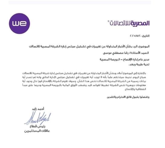 أصدرت الشركة المصرية للإتصالات رسميًا بيانا نفت فيه ما تردد من شائعات حول إحداث اى تغييرات في مجلس الإدارة وأكدت فى بيانها أن المجلس الحالي لم يشهد أي تغيير ولا توجد أى بيانات رسمية بهذا الشأن.