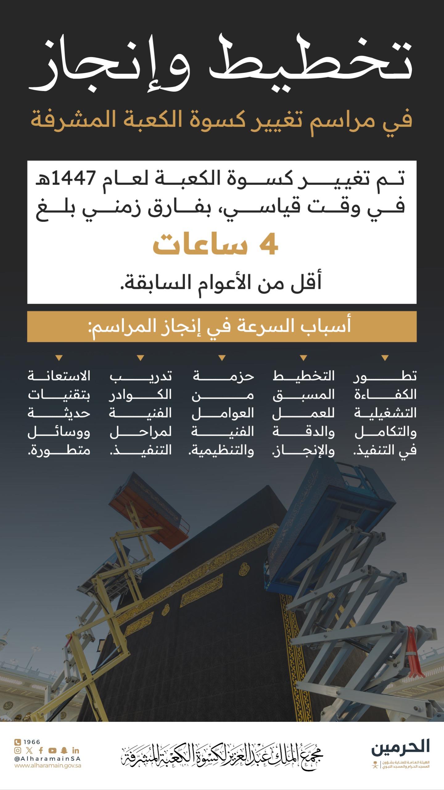 أتمّت الهيئة العامة للعناية بشؤون المسجد الحرام والمسجد النبوي مراسم استبدال كسوة الكعبة المشرفة لهذا العام 1447هـ في وقتٍ قياسي؛ حيث بدأت أعمال التغيير في تمام الساعة 12:00 منتصف ليل الخميس، غرة شهر الله المحرم، وانتهت في تمام الساعة 6:40 صباحًا من اليوم ذاته، محققة بذلك فارق عمل بلغ 5 ساعات و40 دقيقة عن المدة المعتادة في الأعوام السابقة.