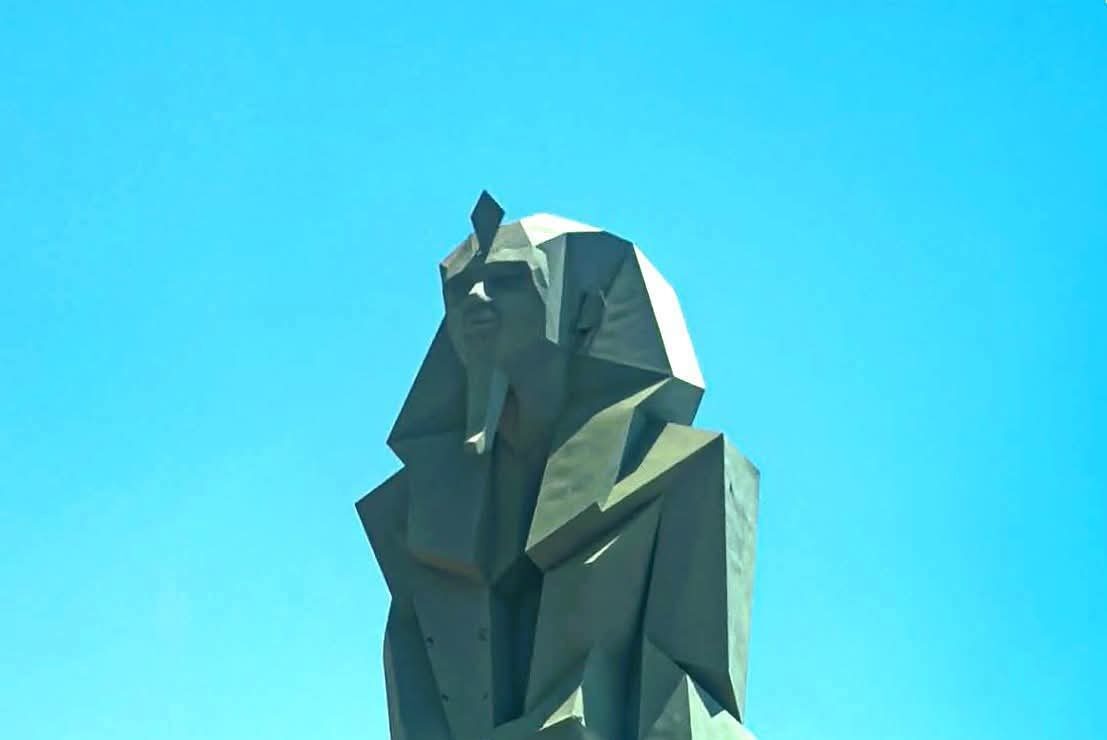 التمثال القائم عند مدخل طريق مصر–إسكندرية الصحراوي ليس مجرد كتلة من المعدن أو علامة ضخمة على أطراف الطريق، بل هو أثر بصري معماري يتجاوز فكرة النصب إلى كونه تجربة وجودية كاملة. إن هندسته المثلثية المتكسرة التي تشكل جسده الضخم ليست حلًا تشكيليًا عابرًا، بل هي الترجمة النحتية الأكثر صدقًا لفلسفة المتحف المصري الكبير، حيث يلتقي الفن بالمعمار في وحدة جمالية واحدة. إن من يشاهد التمثال من داخل السيارات المسرعة بسرعة تقارب ستين كيلومترًا لن يتمكن من استيعاب جميع تفاصيله البنائية الدقيقة، لأن العناصر الهندسية المتعددة تتلاشى في سرعة الحركة، غير أن البورتريه المصري القديم يظل حاضرًا في جوهر الرؤية، ويصبح الضوء والظل المتولدان من تداخل الأوجه المثلثة على الجذع هما النص البصري الحقيقي الذي يترسخ في الذاكرة.