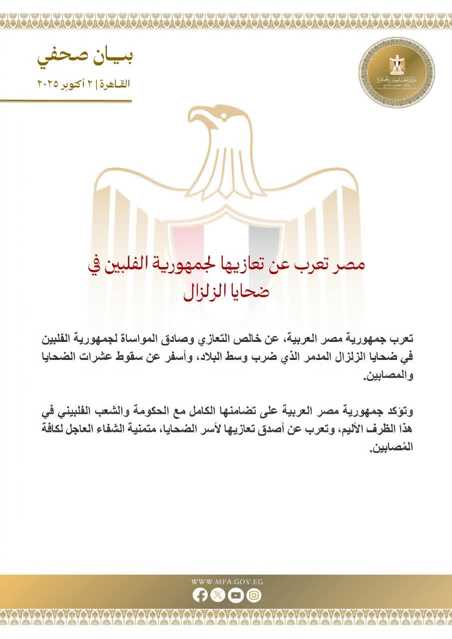 أعربت جمهورية مصر العربية، عن خالص التعازى وصادق المواساة لجمهورية الفلبين فى ضحايا الزلزال المدمر الذى ضرب وسط البلاد، وأسفر عن سقوط عشرات الضحايا والمصابين.
